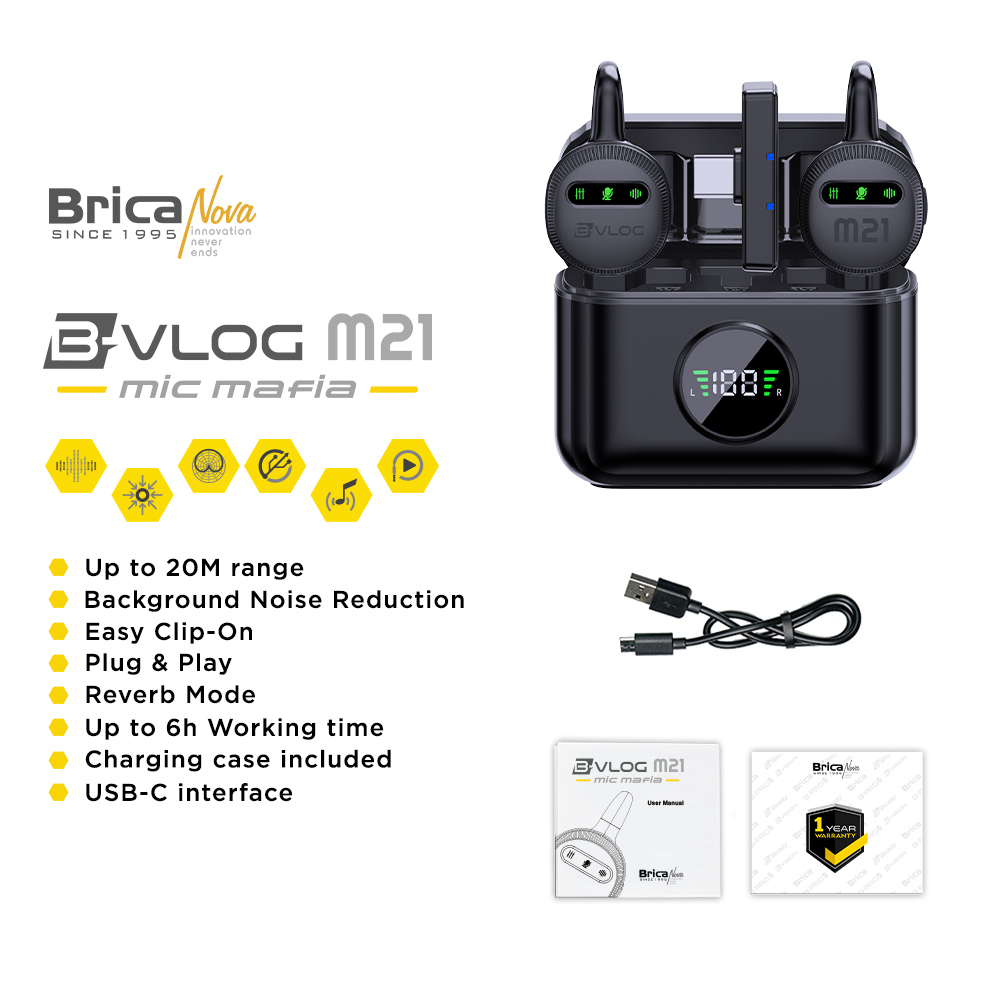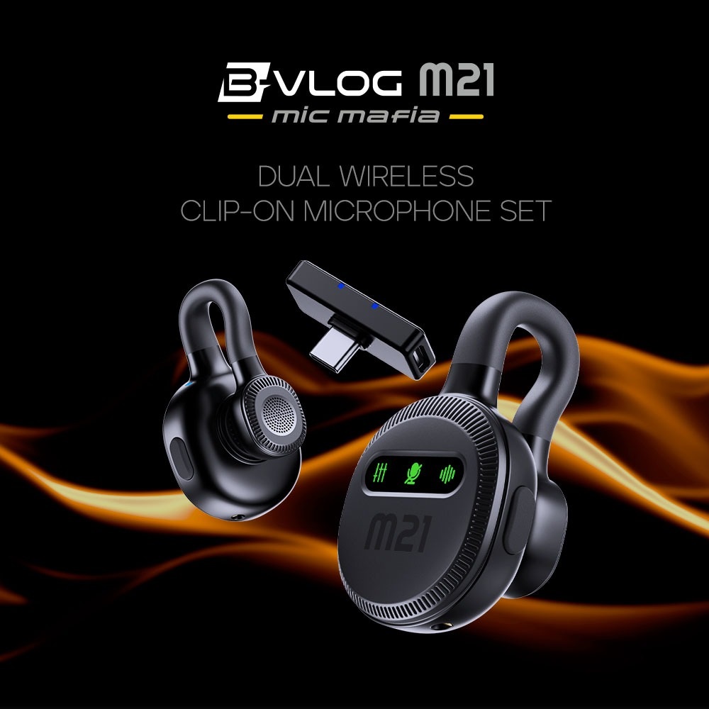 Introducing B-VLOG M21 wireless microphone. This product can help to improve the sound quality on your contents, with up to 20m transmission range, background noise reduction, and charging case for portability and easier storage.